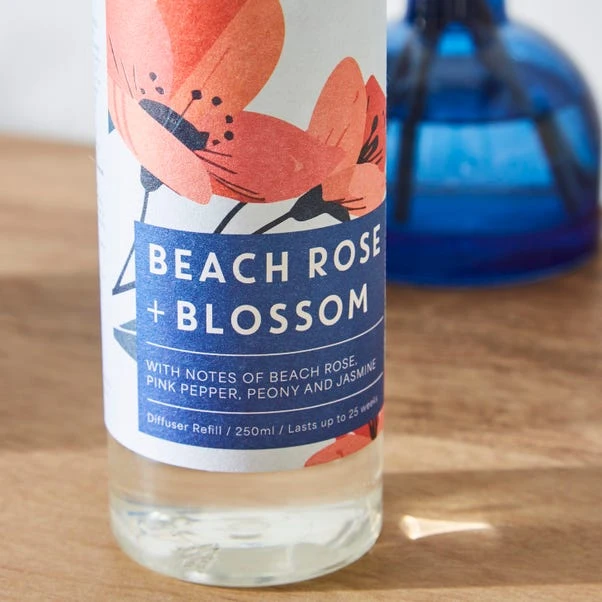 Add a fresh, floral scent to your home with this gorgeous diffuser refill, designed to brighten any space. The uplifting fragrance blends sparkling ozonic notes with the delicate floral scent of sun-kissed beach rose, while soft pink pepper combines with sweet peony and jasmine for a truly luxurious fragrance. This 250ml diffuser refill is designed to reinvigorate your favourite empty diffuser – perfect for adding a touch of luxury to your home.