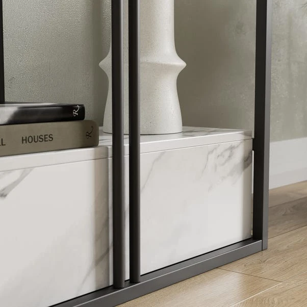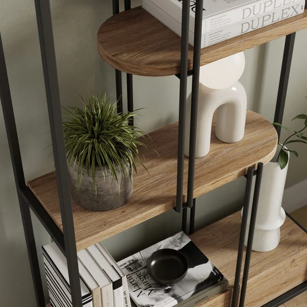 This tall shelving unit combines high functionality with modern design elements to meet your storage needs while adding a touch of sophistication to any room. Crafted with sturdy metal frames and featuring large shelves, this piece seamlessly blends durability with elegance. Its tall design offers ample storage space, perfect for displaying books, decorative items, or organising essentials in style.
