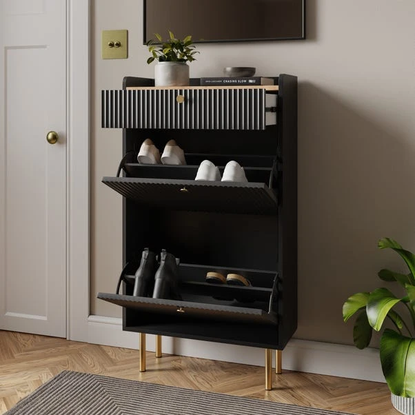 This shoe cabinet combines beautiful style with practical storage solutions. With two tiers that fold out to accommodate shoes and an additional top storage drawer for smaller items, your entrance space will always look fabulous and organized. Designed with a slim profile to make the best use of narrow areas, this shoe storage unit is perfect for maximising space efficiency in your home. It can accommodate up to 8 pairs of shoes up to UK Size 9, ensuring your footwear is neatly tucked away while offering a convenient display option.