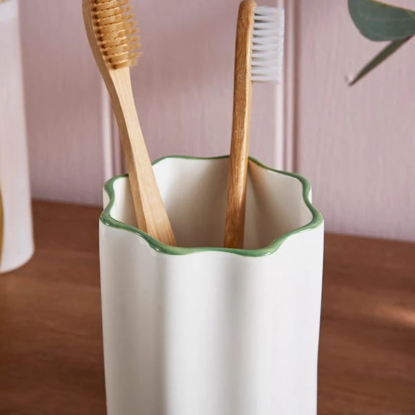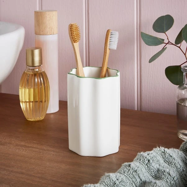 Add a playful statement to your bathroom décor with this charming toothbrush holder, featuring a scalloped design, in a white colourway with a pop of green. A member of the Heart and Soul collection, this piece is available alongside matching items, allowing you to create a cohesive bathroom aesthetic.