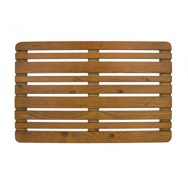 The Keepers Lodge Wood Duck Board combines functionality with modern style. Made from bamboo in a rich dark finish, it features anti-slip pads at the bottom for added safety. Perfect for adding a touch of sophistication to your bathroom floor.