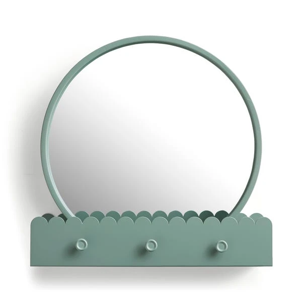 Elevate your decor with the Remi Round Wall Mirror with Scalloped Shelf. Finished in a beautiful sage-green colourway, it adds a touch of elegance to any room. Featuring a stunning scalloped shelf and convenient hooks, this mirror combines style with functionality, making it a perfect addition to your home.